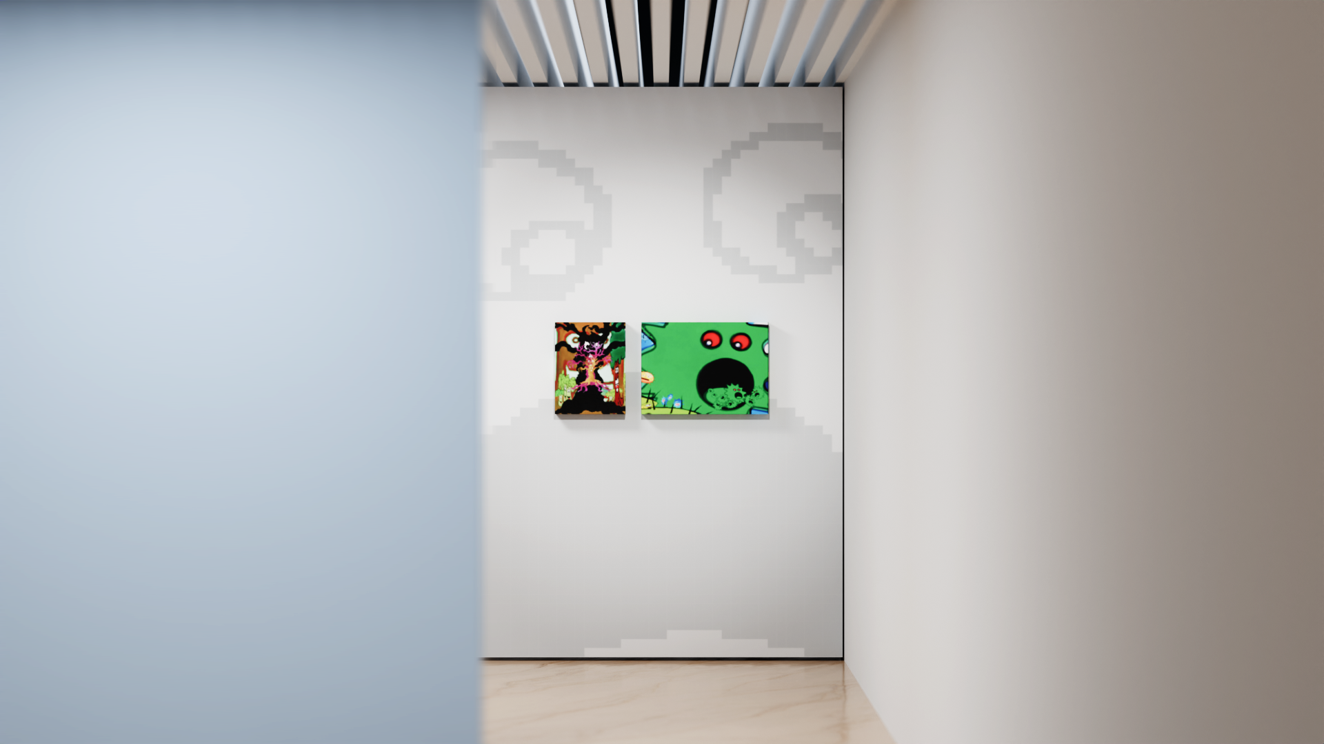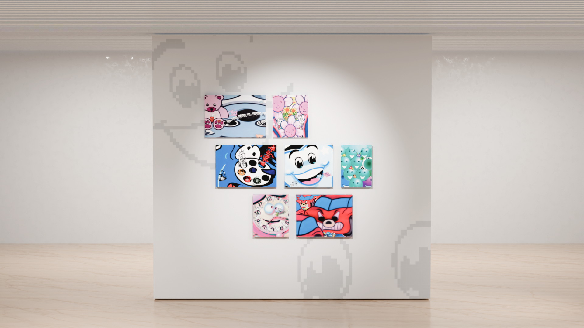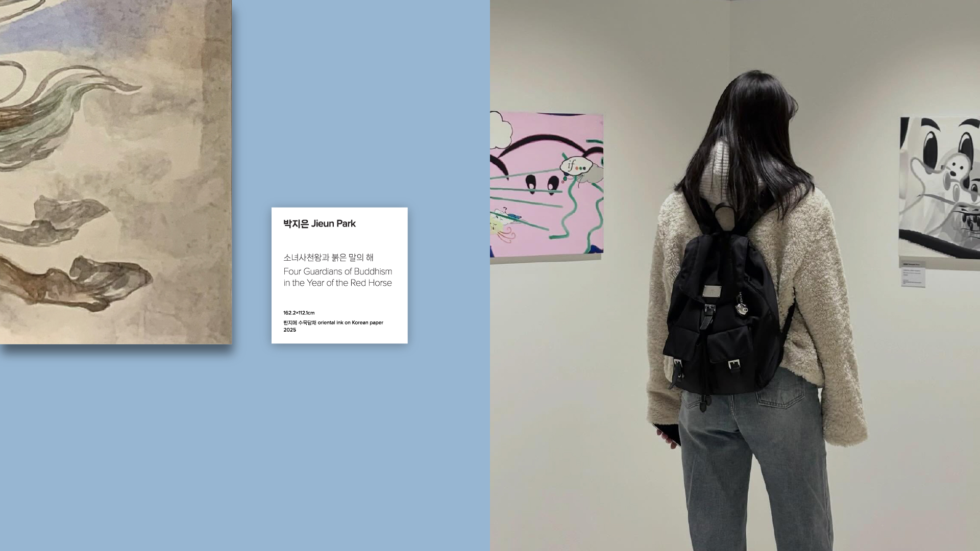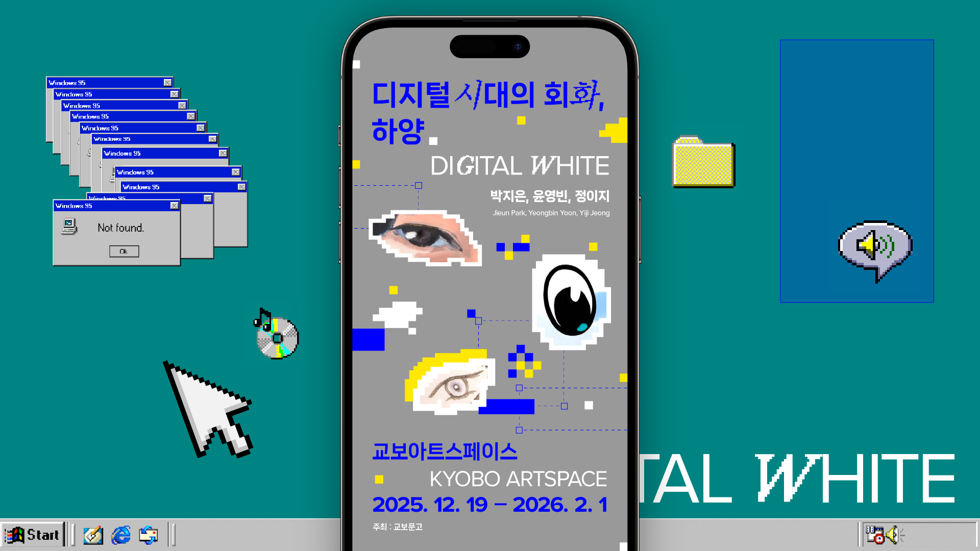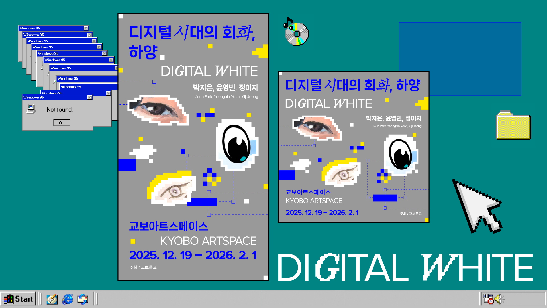 전시 디자인에서는 회화적 물성과 디지털 이미지 구조의 대비를 핵심 전략으로 삼았다. 붓질의 질감과 레이어의 깊이를 유지하면서, 비트맵 기반 그래픽과 저해상도 픽셀 구조를 결합해 아날로그와 디지털이 교차하는 시각 시스템을 구축했다. Y2K Web 감성에서 차용한 분절된 이미지 배열과 화면 구성 방식을 통해, 스크린 환경에서 이미지가 생성·해체·재조합되는 과정을 시각화하고, 회화가 디지털 시대에 확장되는 방식을 그래픽적으로 해석했다.